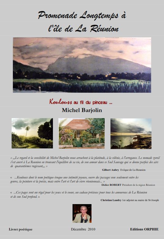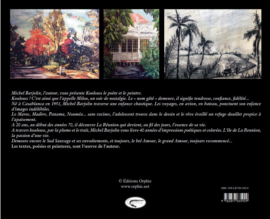 Michel Barjolin, dit « Koulouss », est né le 19 septembre 1951 à Casablanca. Marié à une réunionnaise, il réside à l’île de la Réunion depuis 1973. Aquarelliste reconnu, Koulouss exprime dans sa peinture les émotions que suscite en lui « l’île enchantée ». Écrivain et poète, il nous livre sa vision du monde : « artiste du verbe ; il est aussi un peintre des âmes et des cœurs dont le style – chose rare – est personnel et, à bien des égards, inimitable », selon les bons mots de l’historien Paul Villatoux.